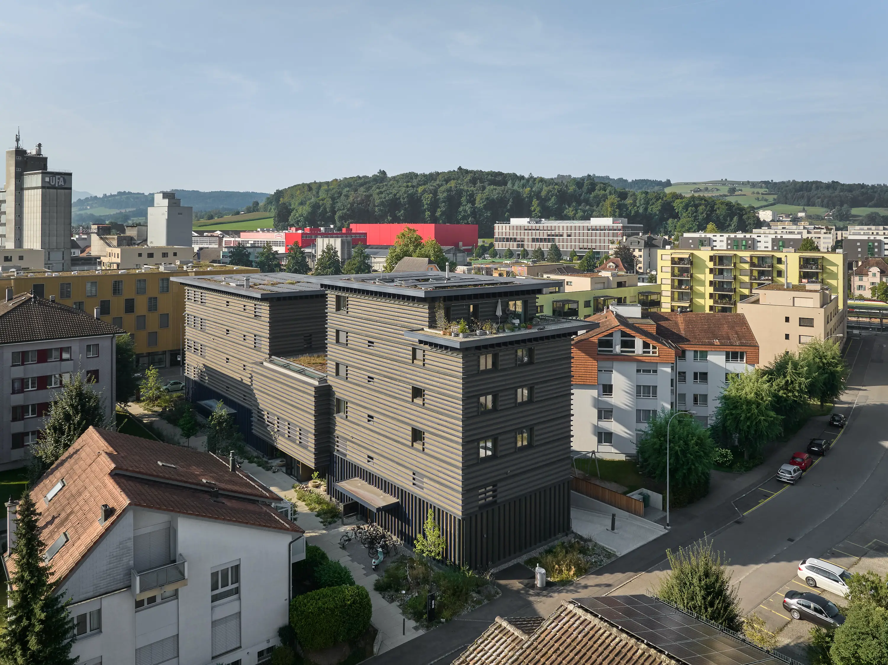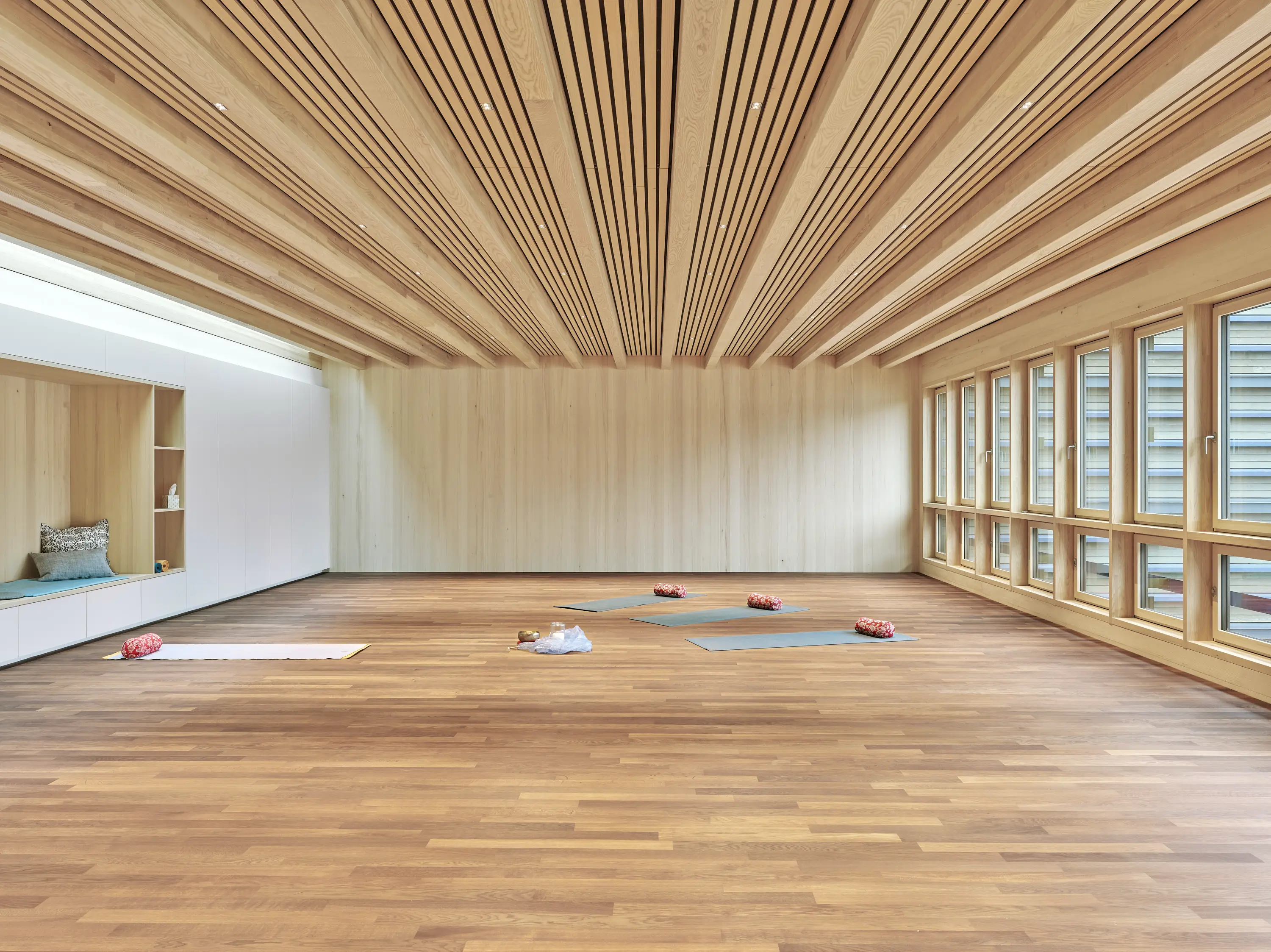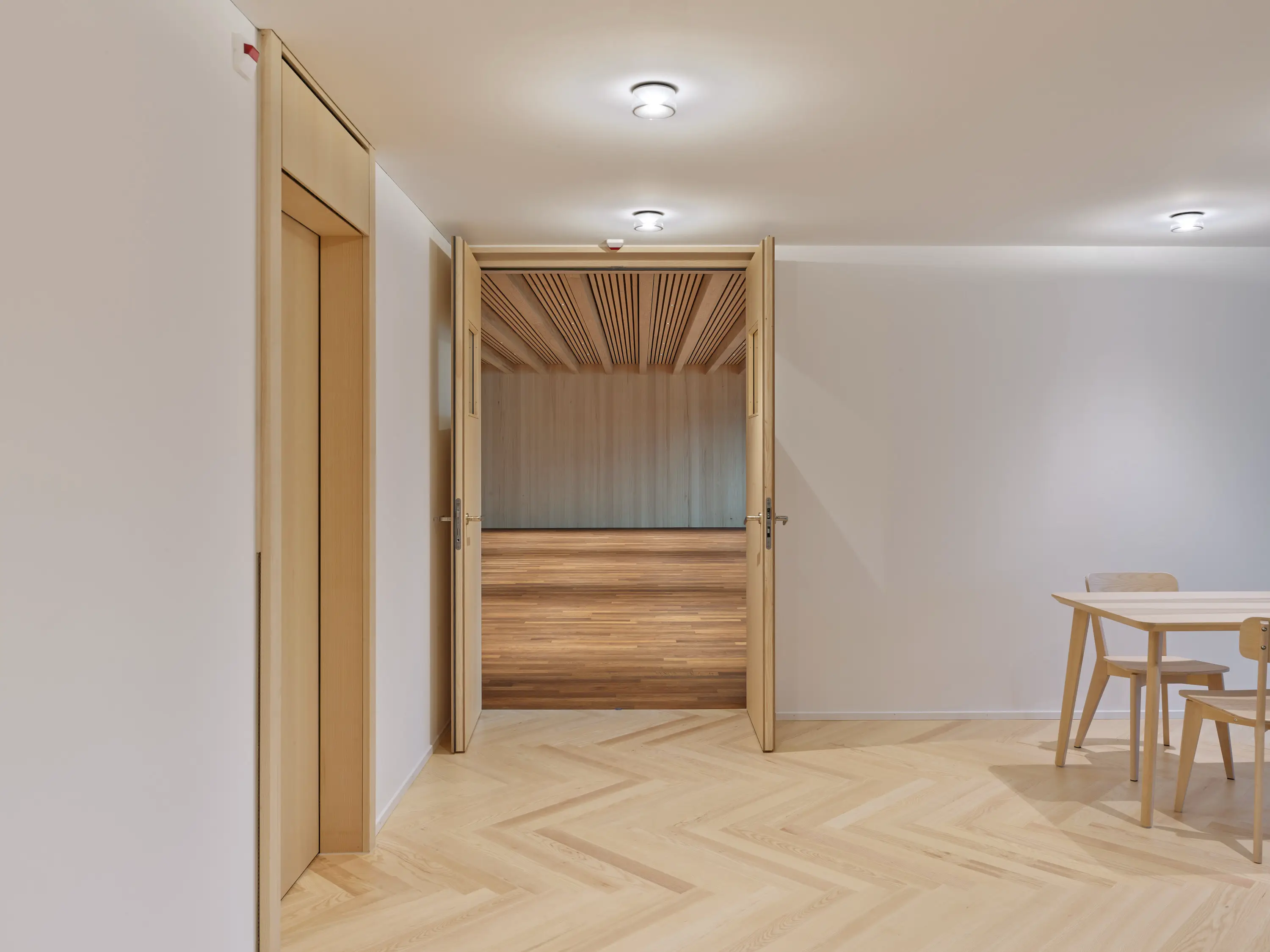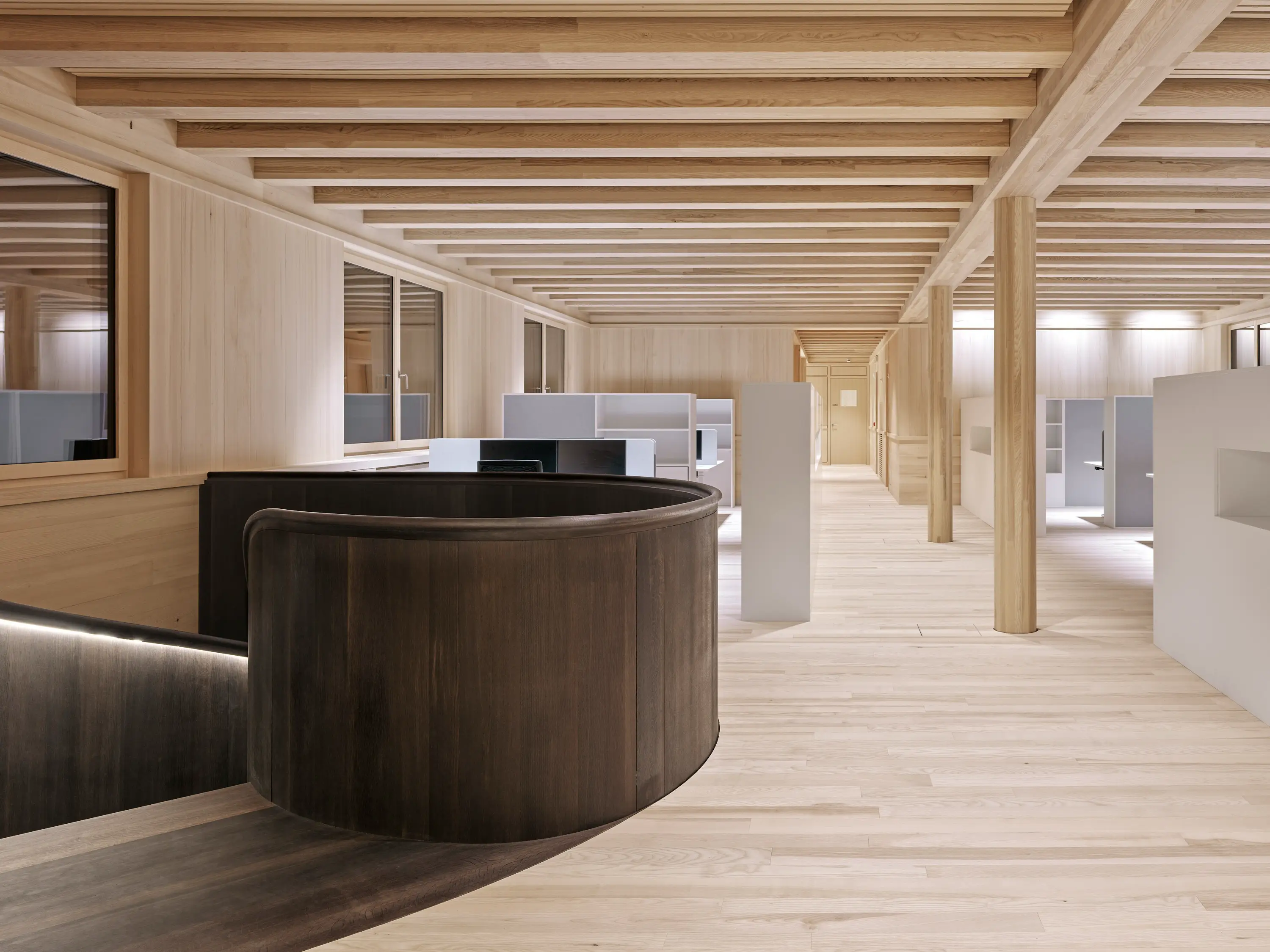 Die Innenräume zeigen Holz nicht als Oberfläche, sondern als tragendes System: sichtbare Struktur, warme Textur, ruhiges Licht. 2022 mit SNBS-Platin zertifiziert und Hauptsitz der PIRMIN JUNG Schweiz AG, demonstriert das Gebäude, wie nachhaltiger Holzbau im urbanen Kontext architektonisch überzeugt.
