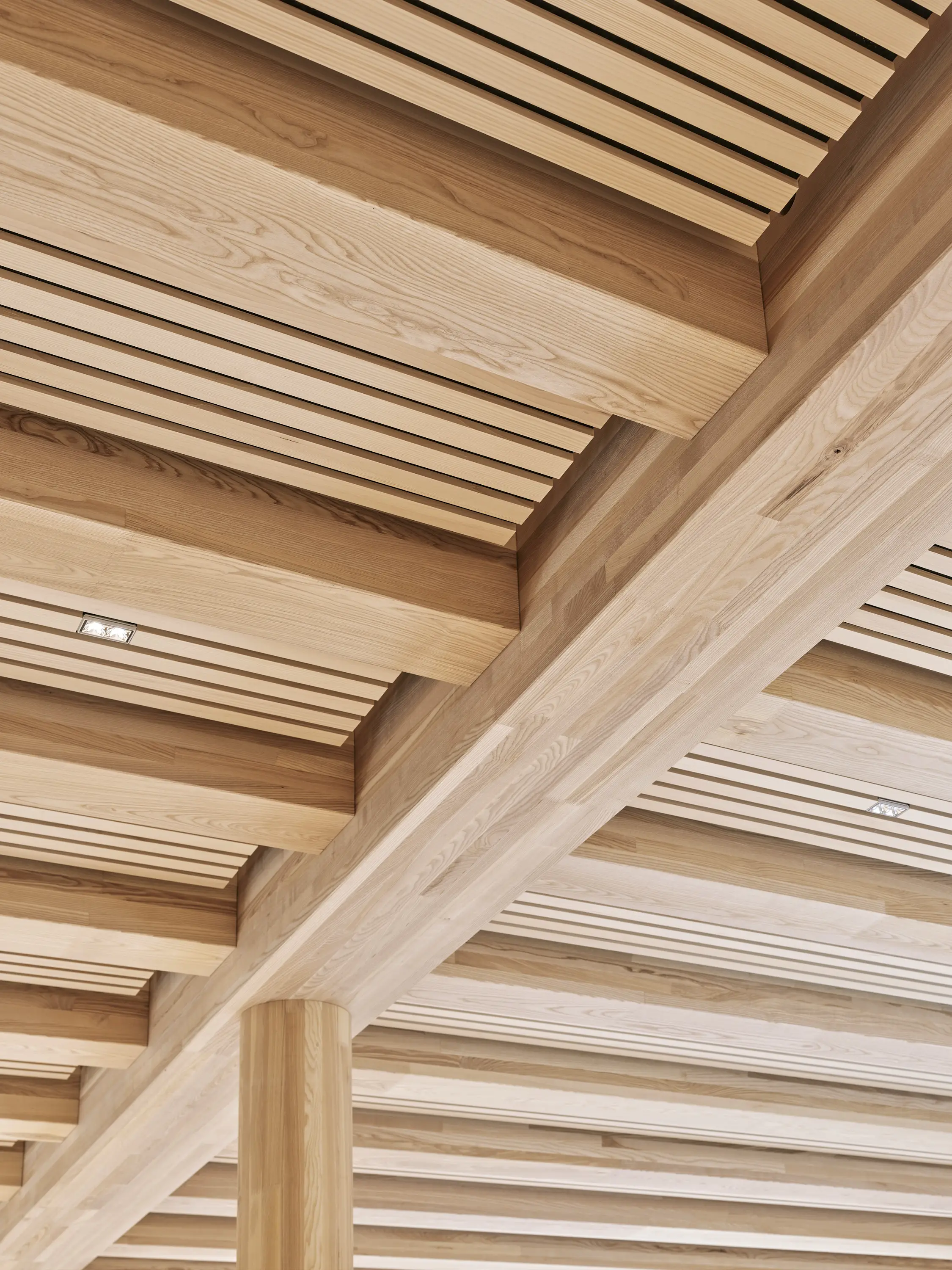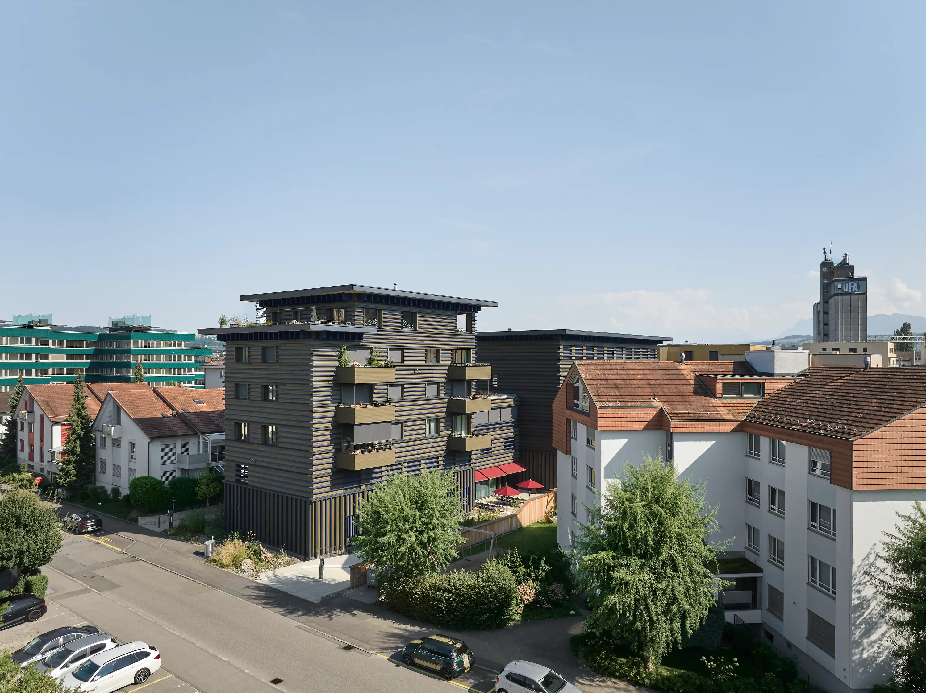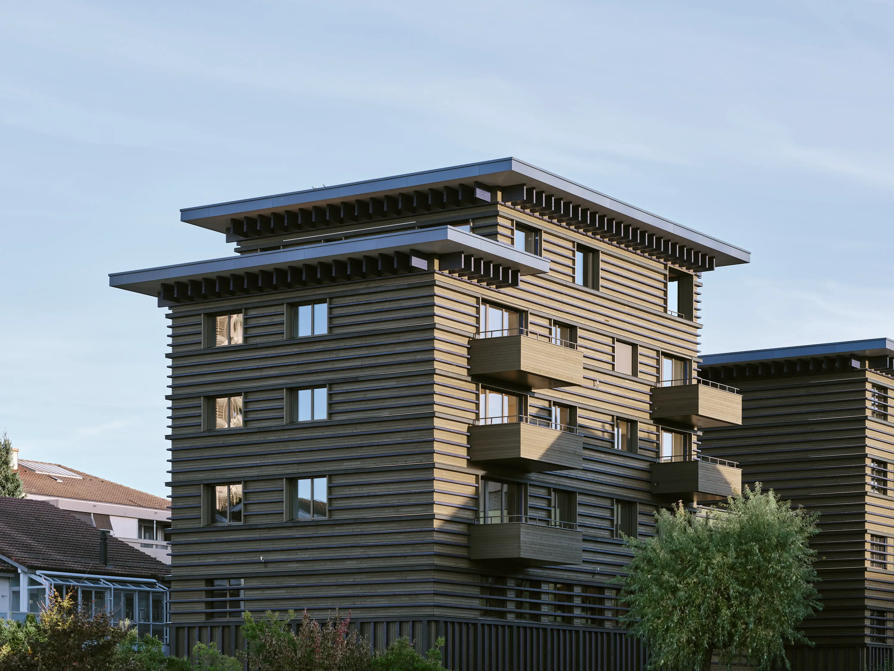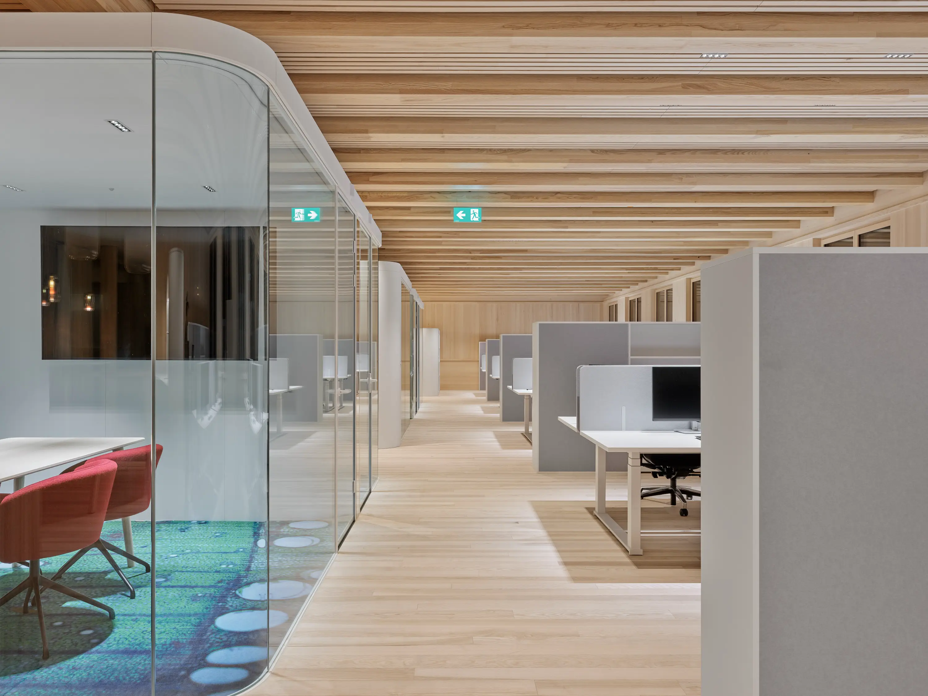 Die Innenräume zeigen Holz nicht als Oberfläche, sondern als tragendes System: sichtbare Struktur, warme Textur, ruhiges Licht. 2022 mit SNBS-Platin zertifiziert und Hauptsitz der PIRMIN JUNG Schweiz AG, demonstriert das Gebäude, wie nachhaltiger Holzbau im urbanen Kontext architektonisch überzeugt.
