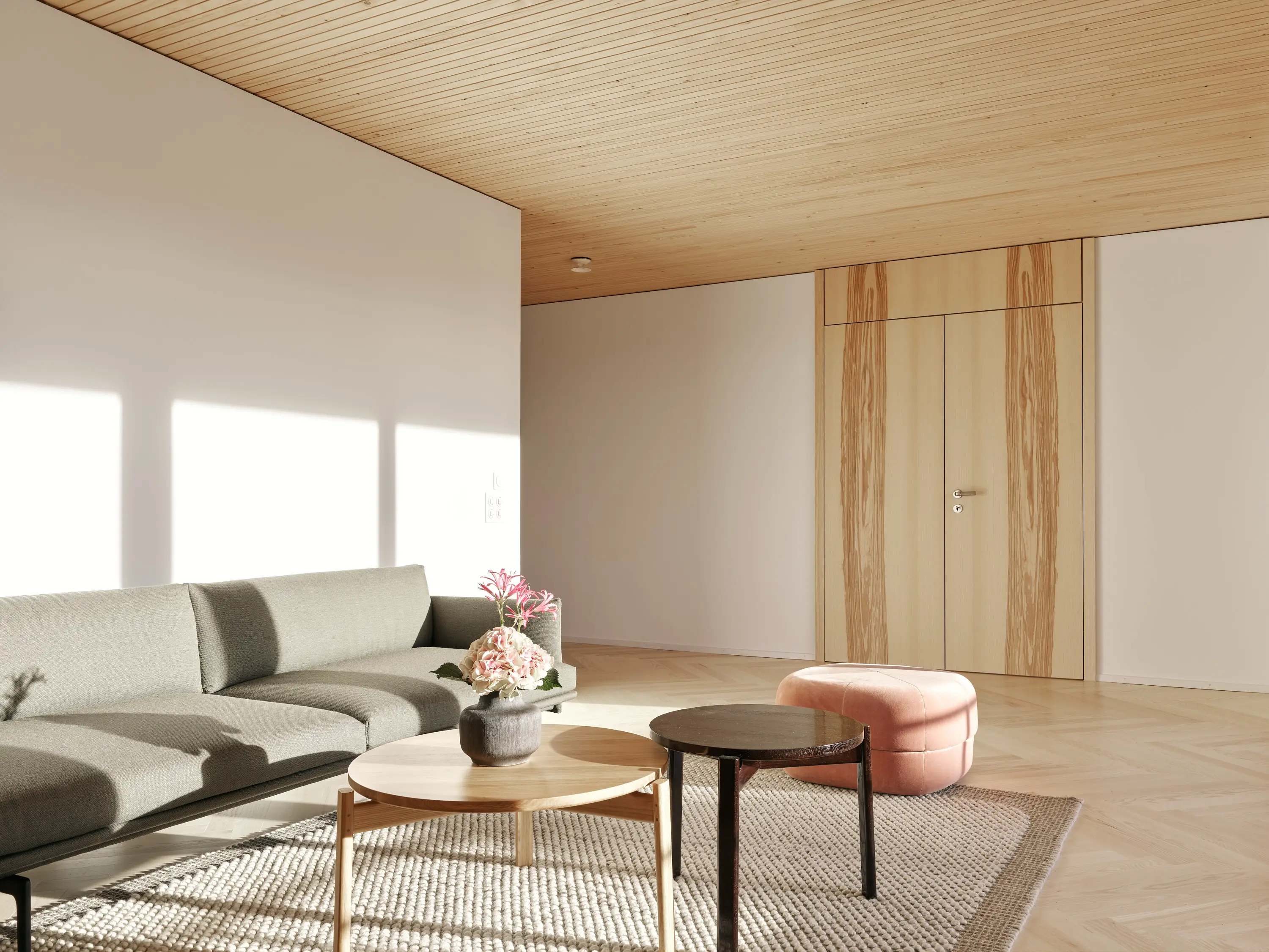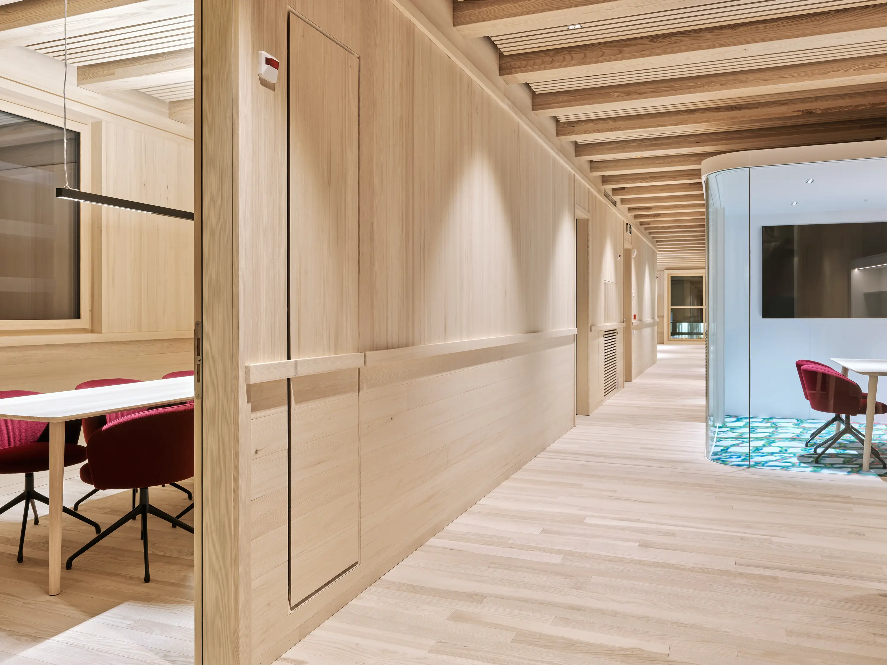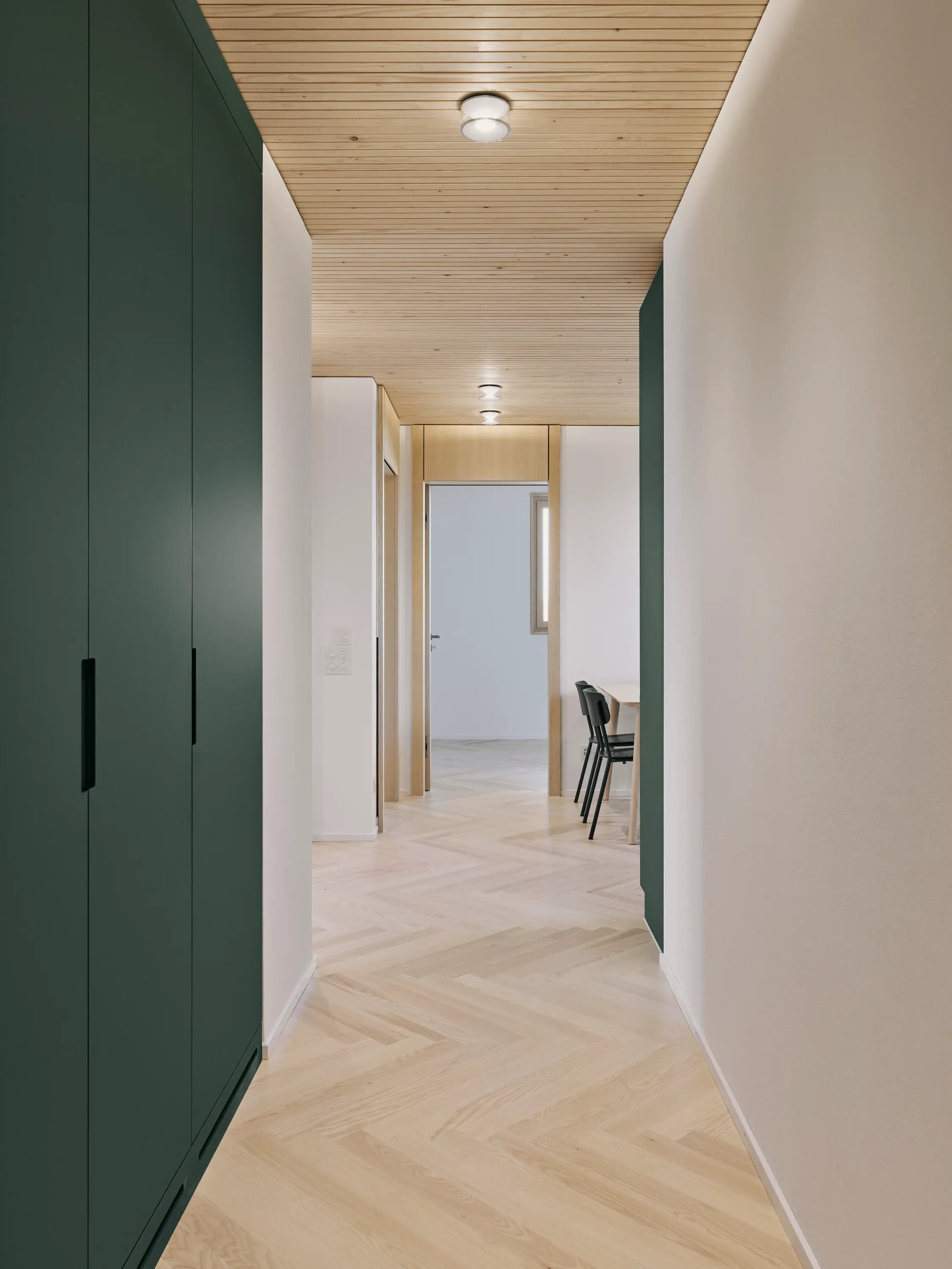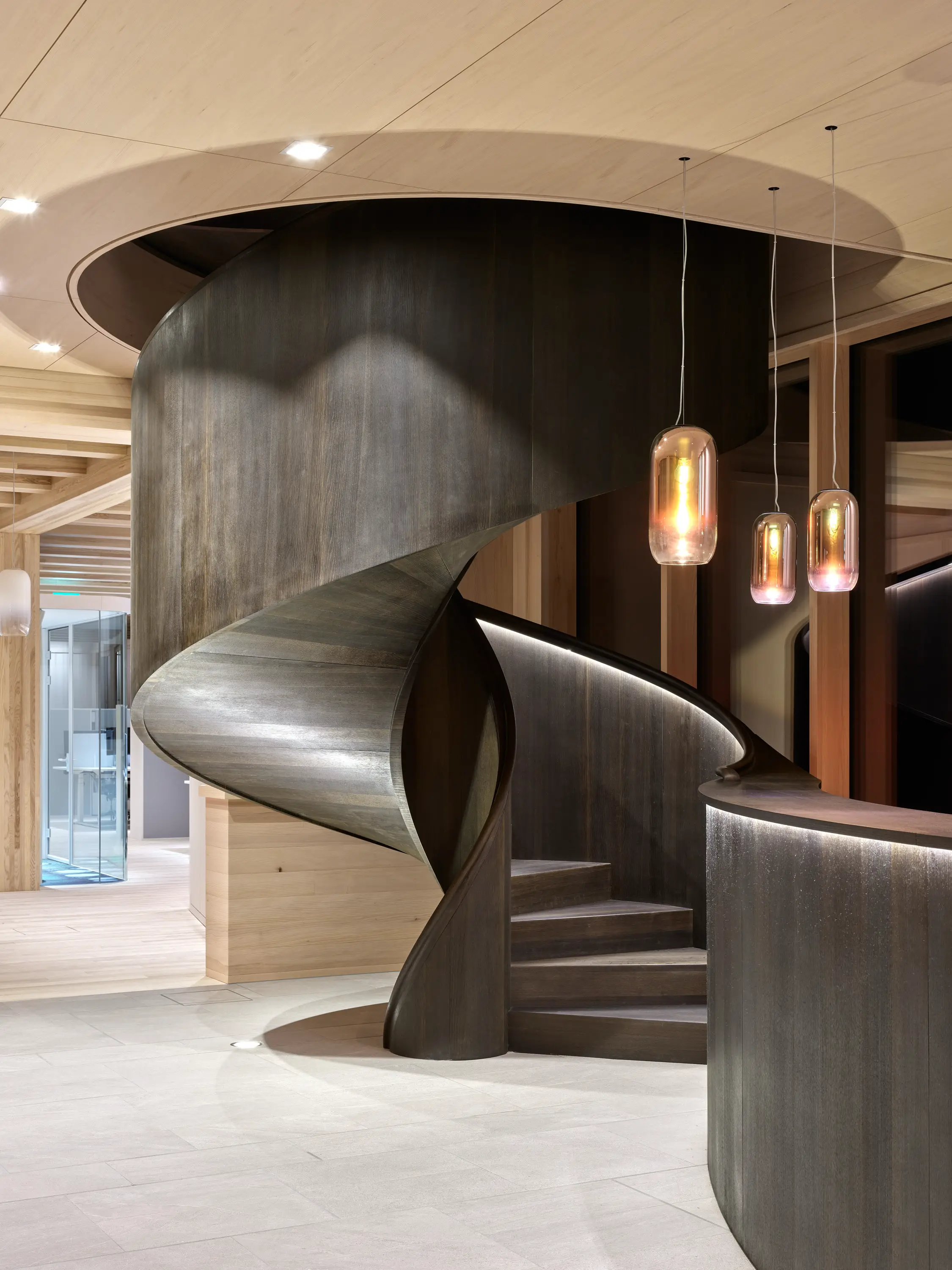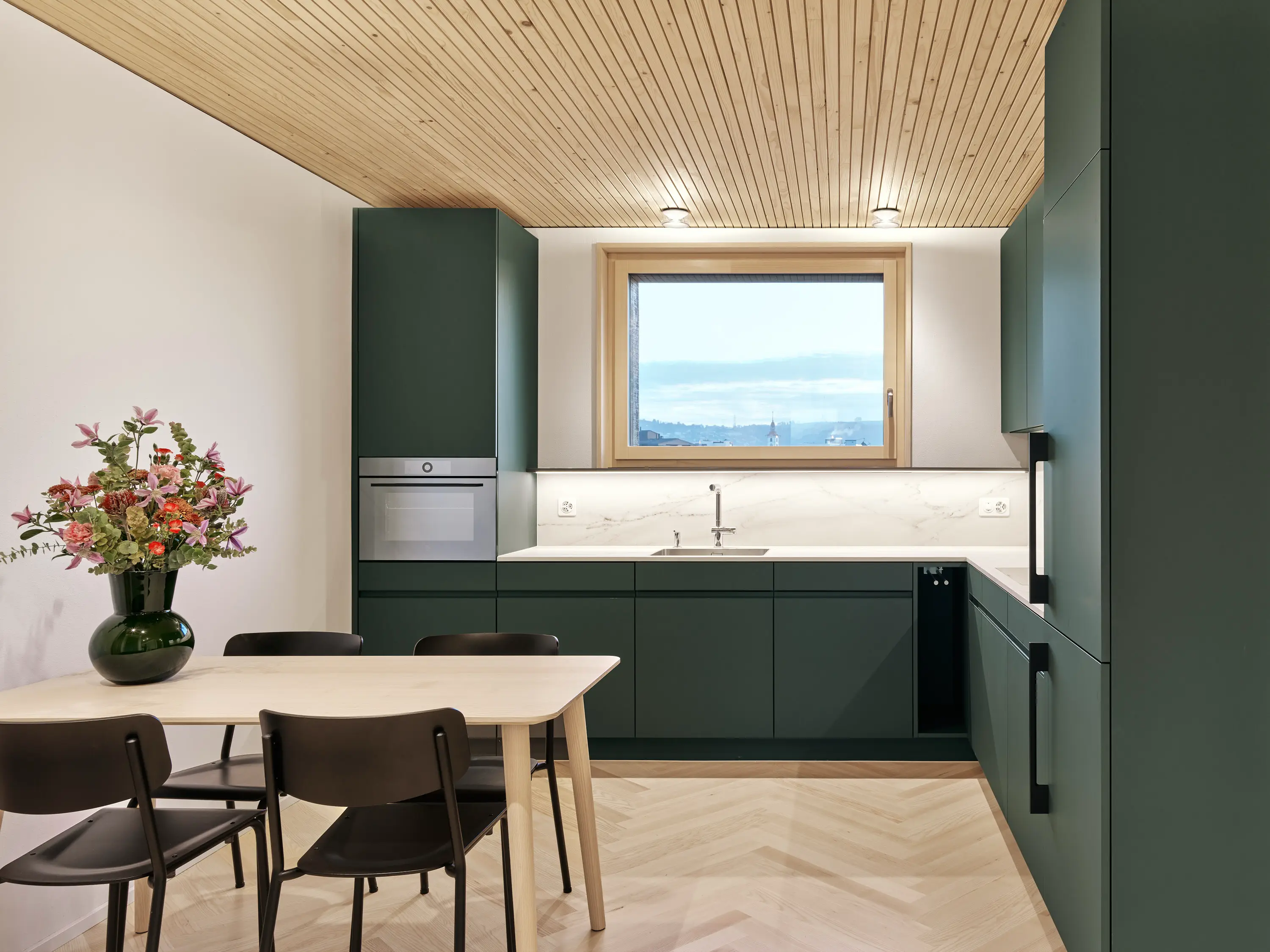 Die Innenräume zeigen Holz nicht als Oberfläche, sondern als tragendes System: sichtbare Struktur, warme Textur, ruhiges Licht. 2022 mit SNBS-Platin zertifiziert und Hauptsitz der PIRMIN JUNG Schweiz AG, demonstriert das Gebäude, wie nachhaltiger Holzbau im urbanen Kontext architektonisch überzeugt.