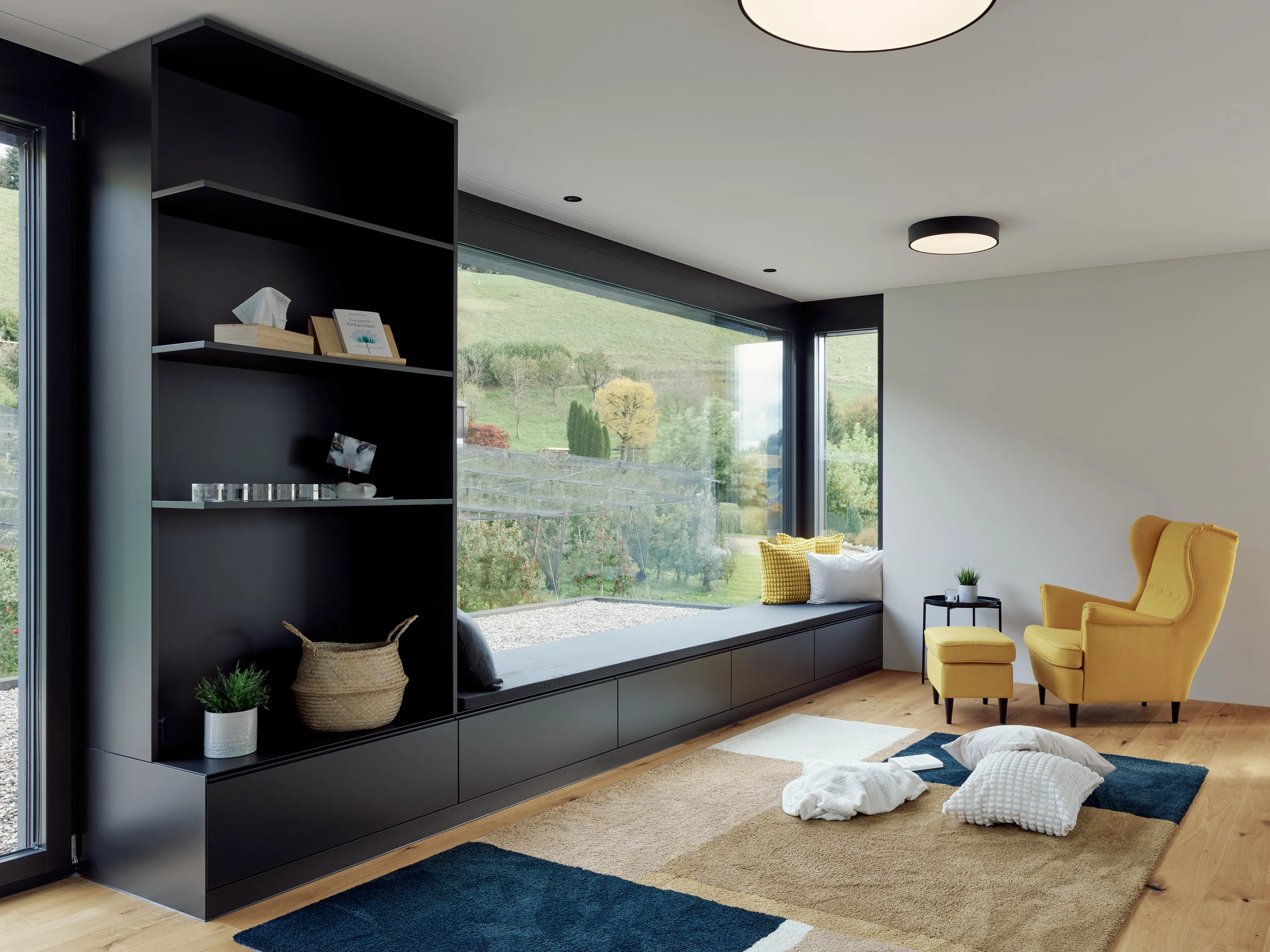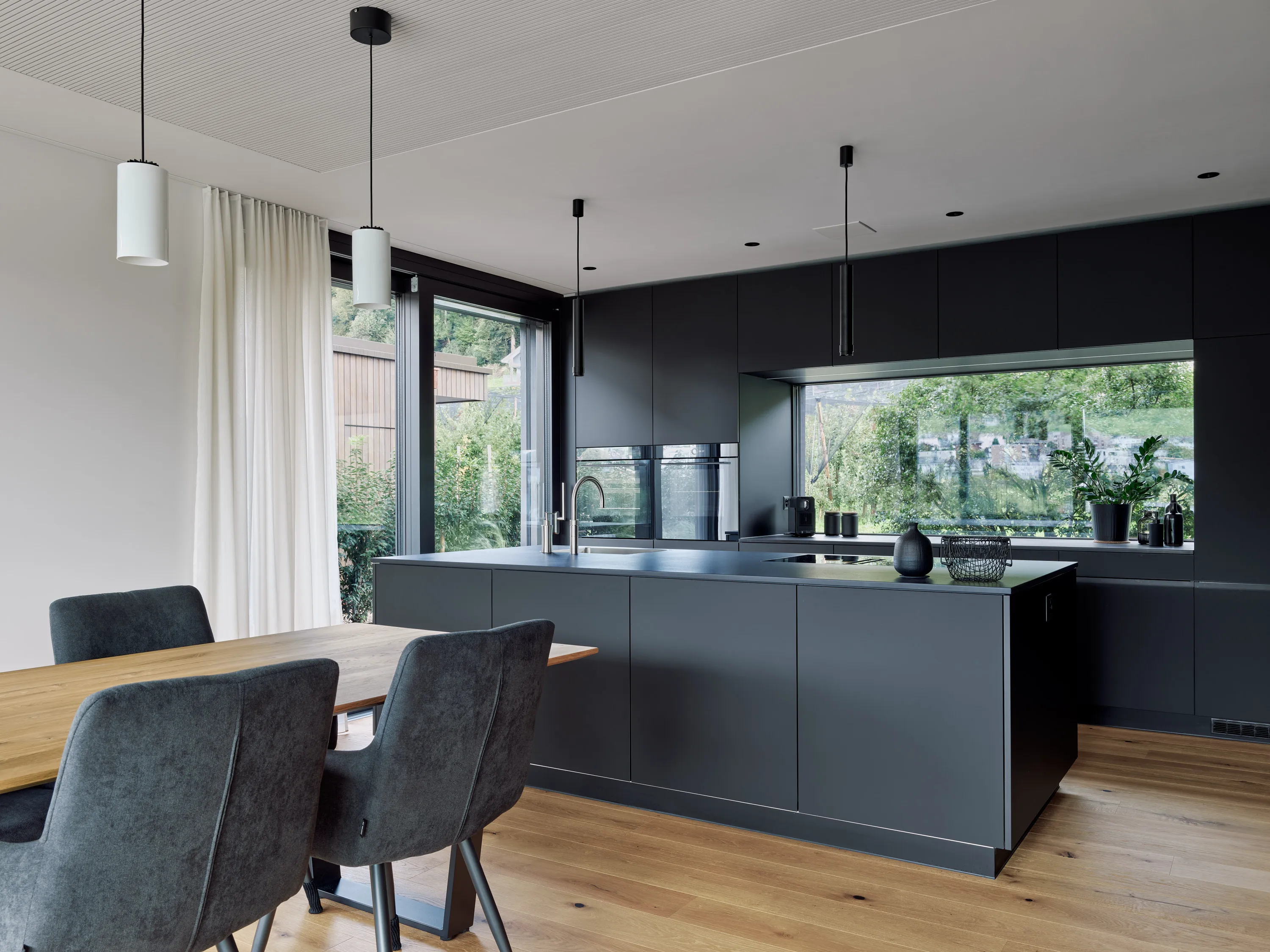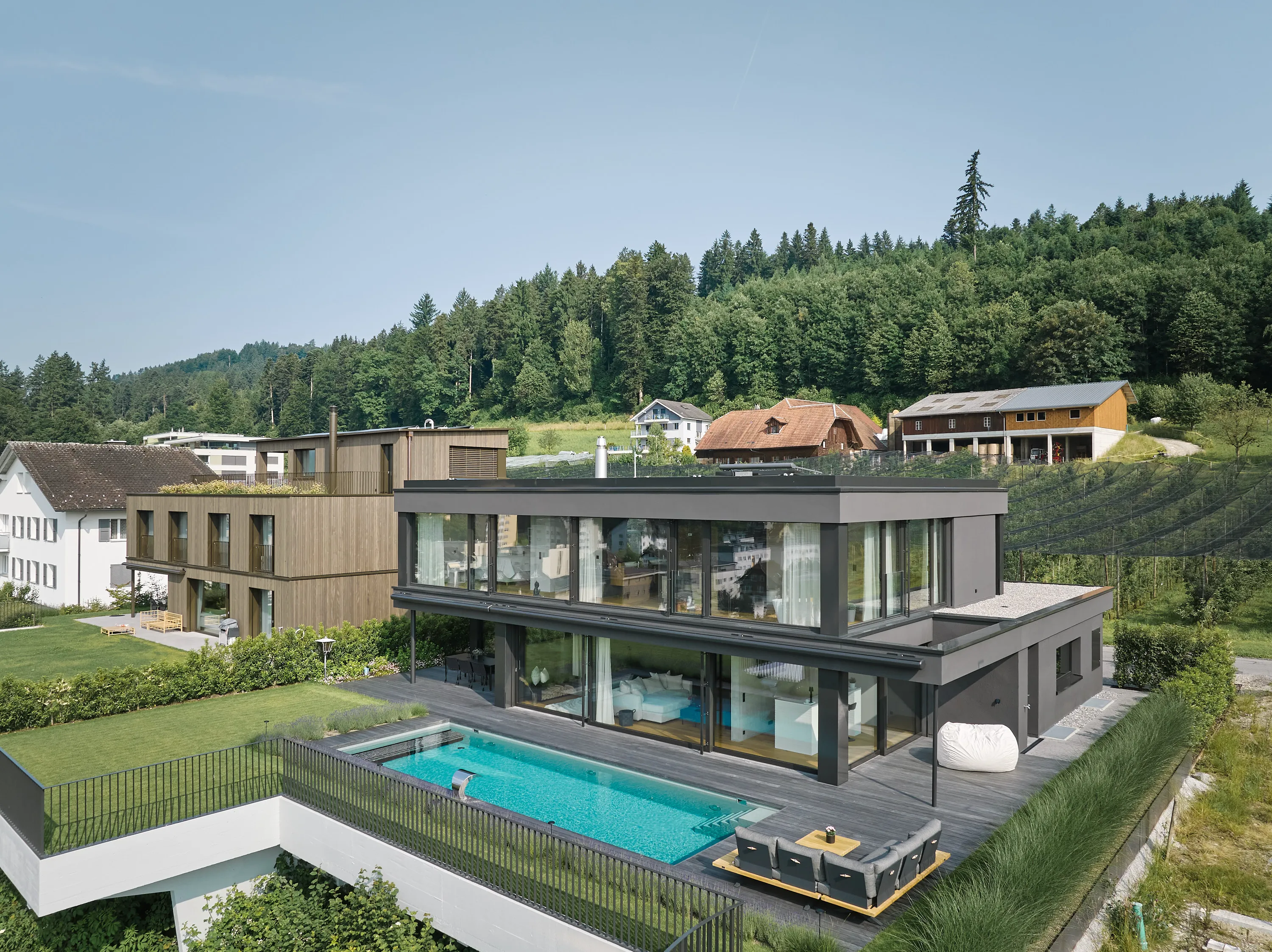 Die einmalige Aussicht prägt die Gebäudeform und die Grundrisse. Grosszügige Fensterflächen öffnen den Blick in die Landschaft, während die offene Raumorganisation, abgestimmte Materialien und der Aussenpool Innen- und Aussenraum zu einem harmonischen Ganzen verbinden.