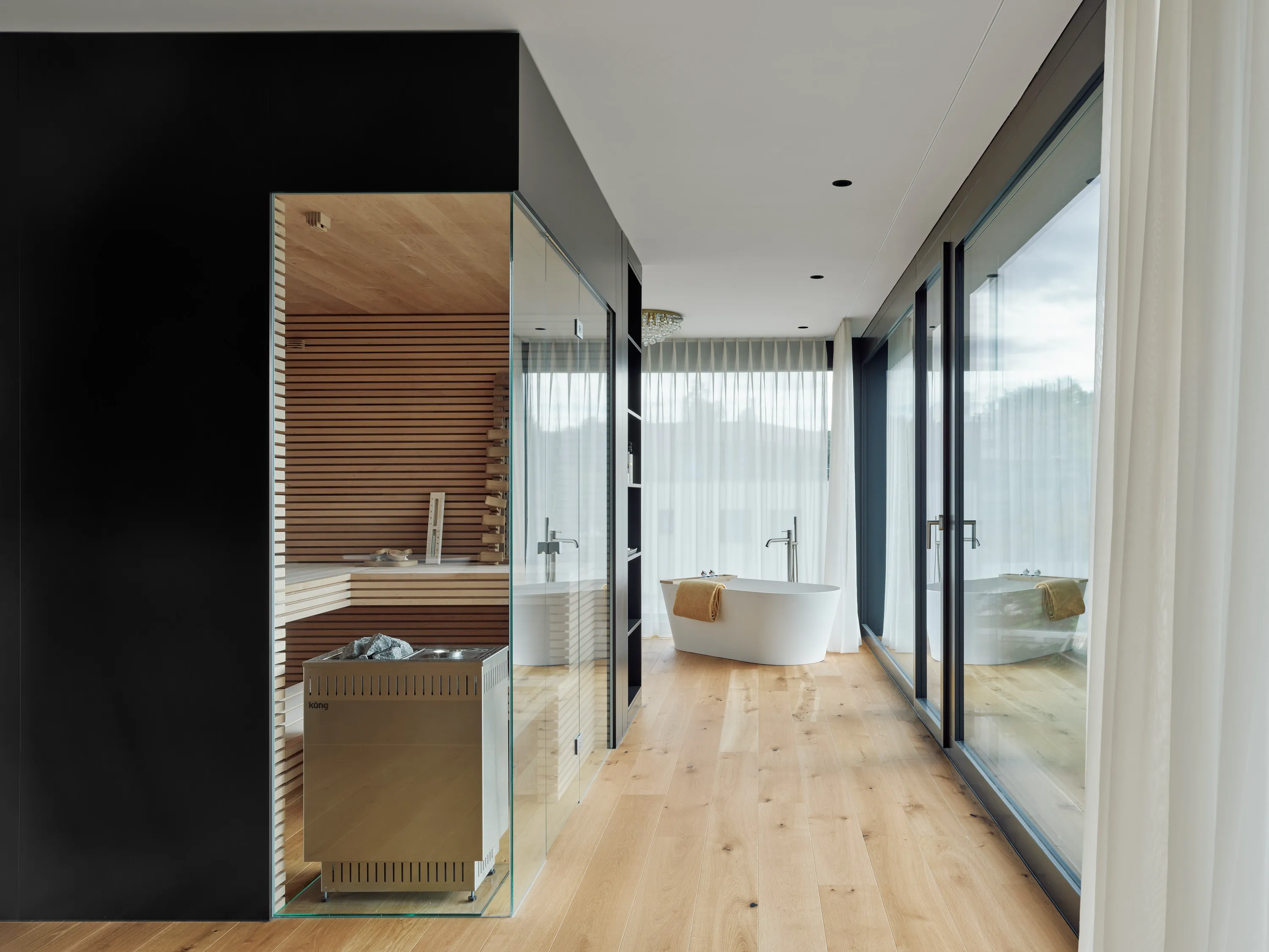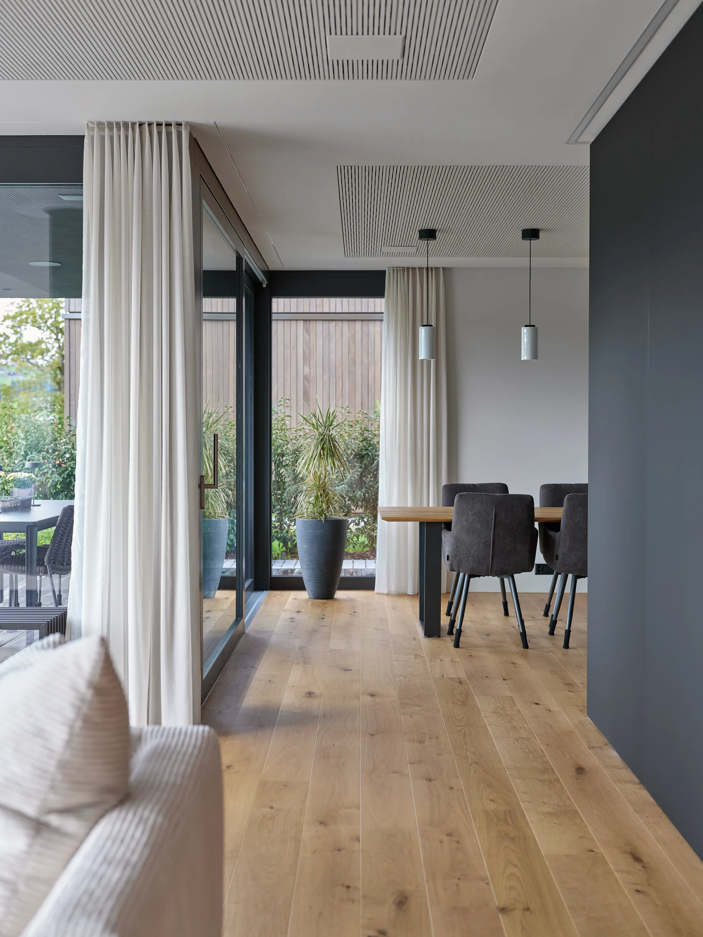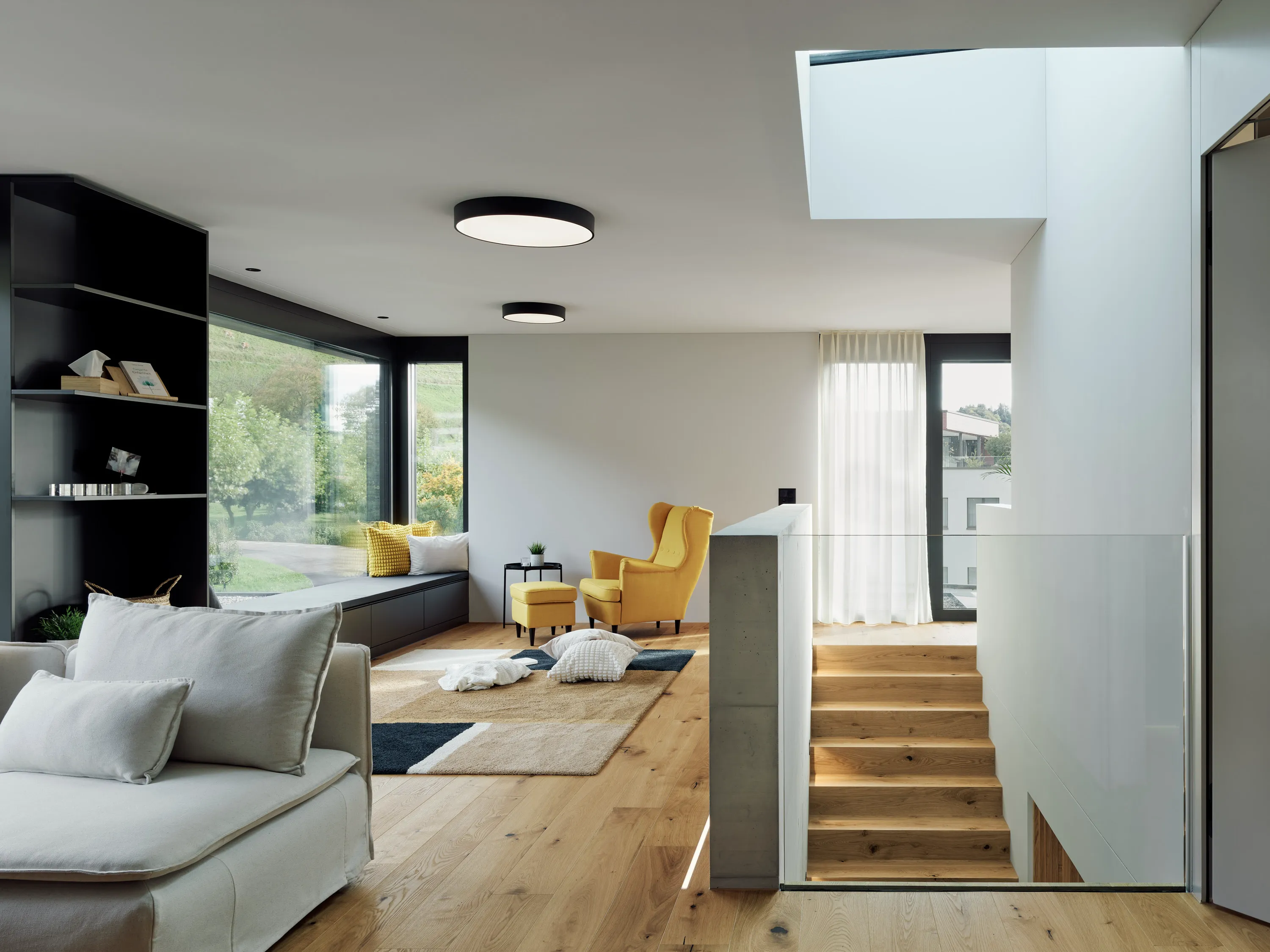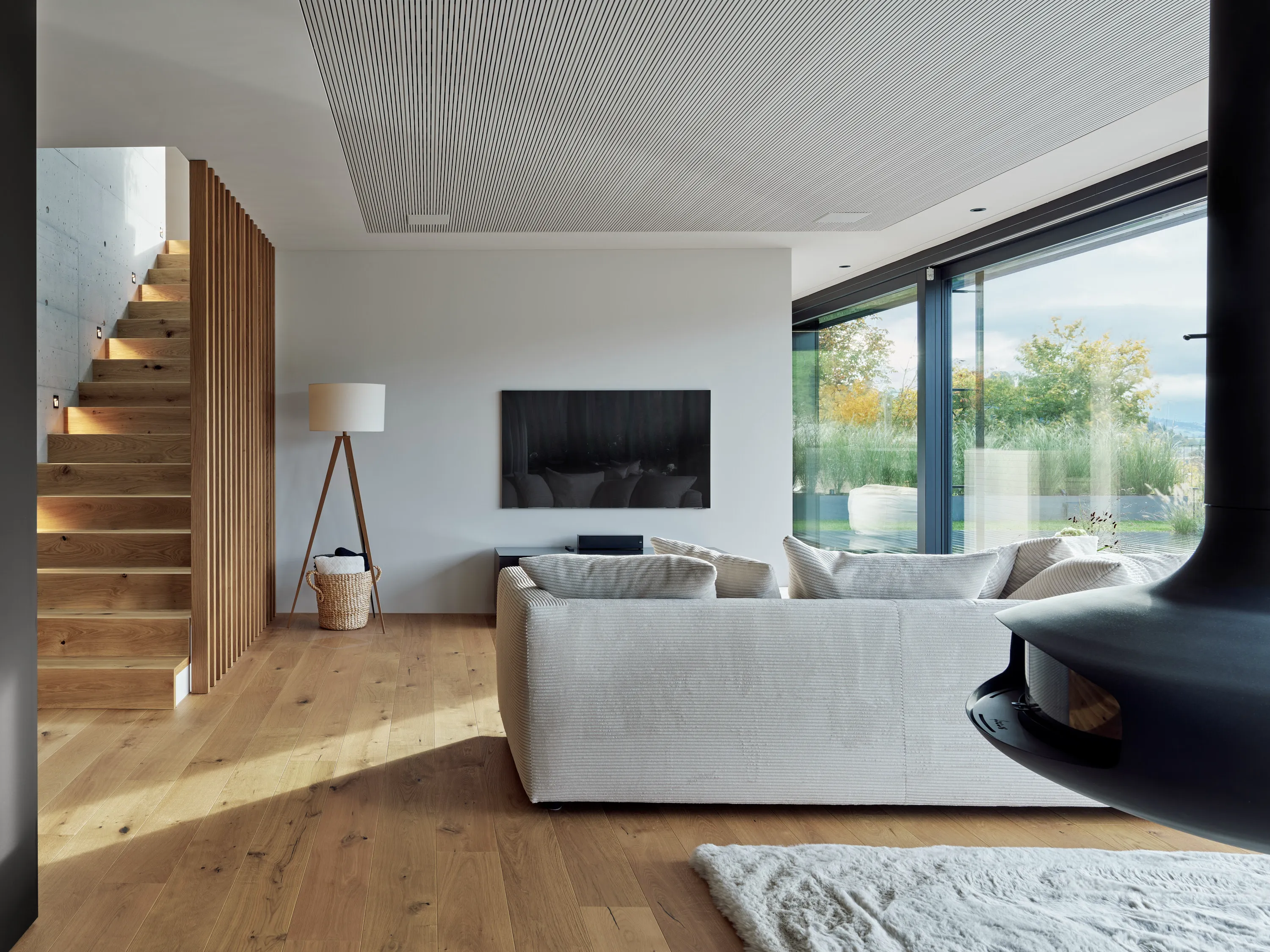 Die einmalige Aussicht prägt die Gebäudeform und die Grundrisse. Grosszügige Fensterflächen öffnen den Blick in die Landschaft, während die offene Raumorganisation, abgestimmte Materialien und der Aussenpool Innen- und Aussenraum zu einem harmonischen Ganzen verbinden.