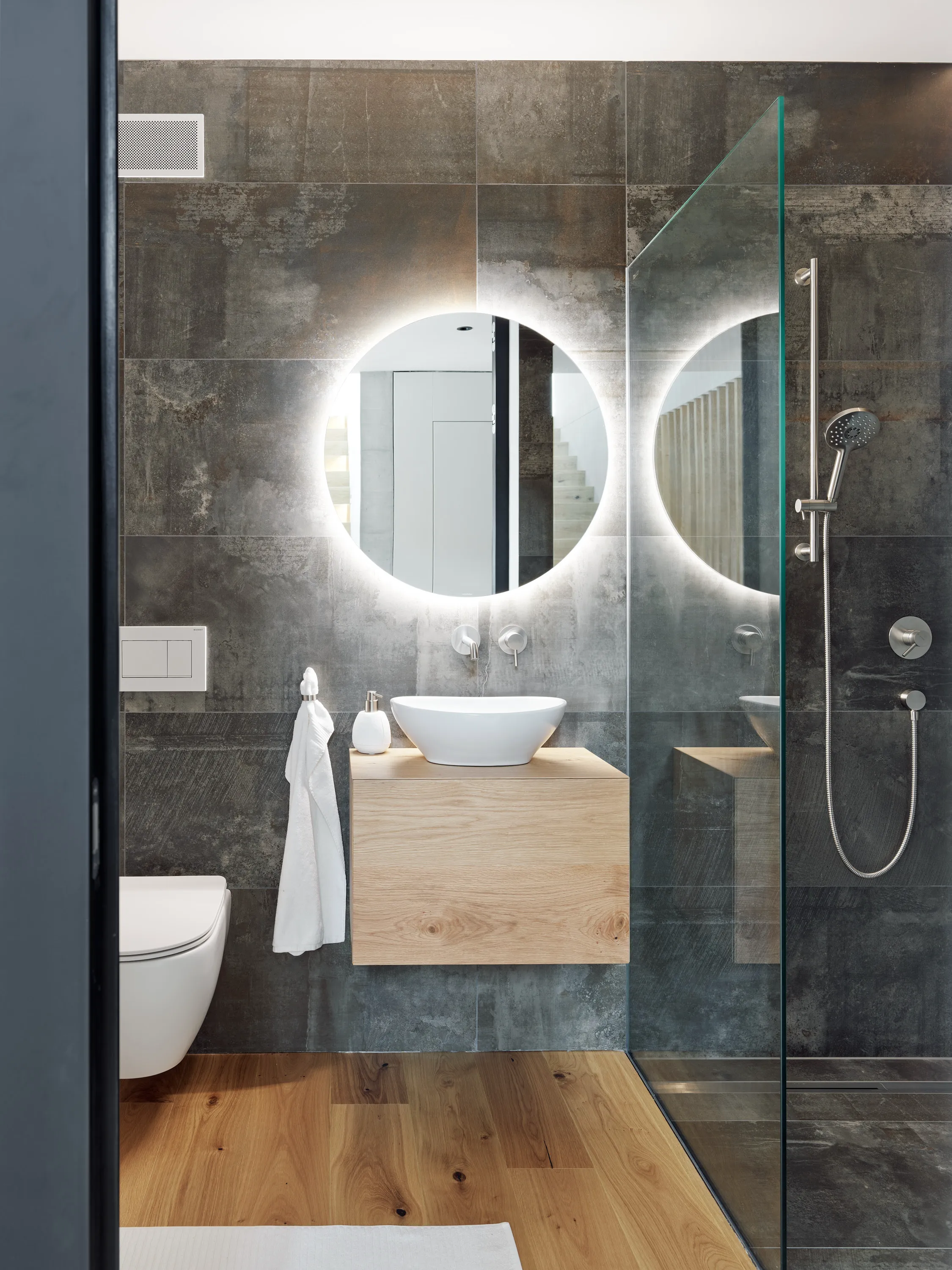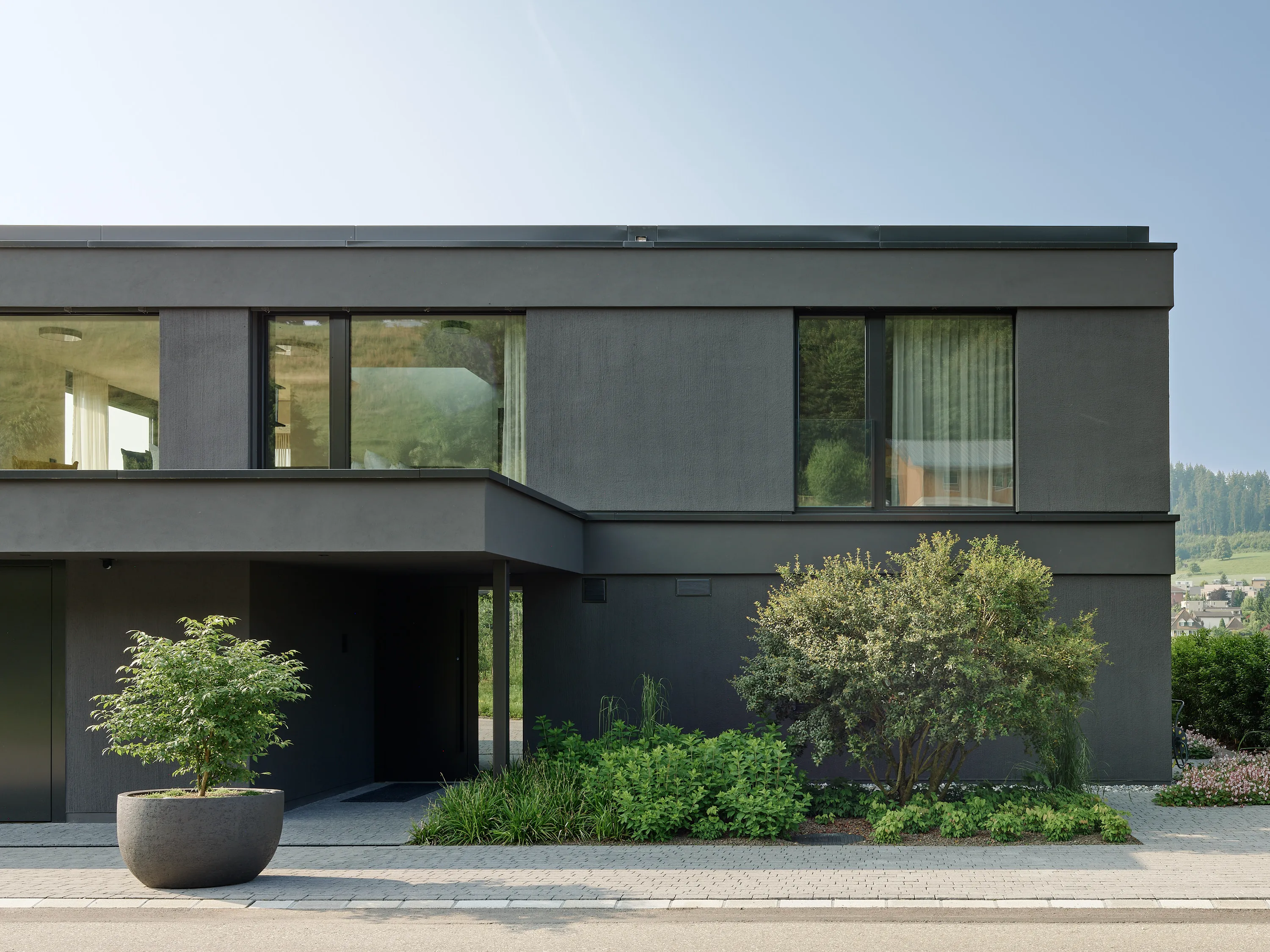 Schlicht und modern tritt das Einfamilienhaus an erhöhter Lage über Willisau auf. Die reduzierte Volumetrie und die dunkle Fassade mit charakteristischer Putzstruktur verleihen dem Baukörper ein prägnantes, eigenständiges Erscheinungsbild.