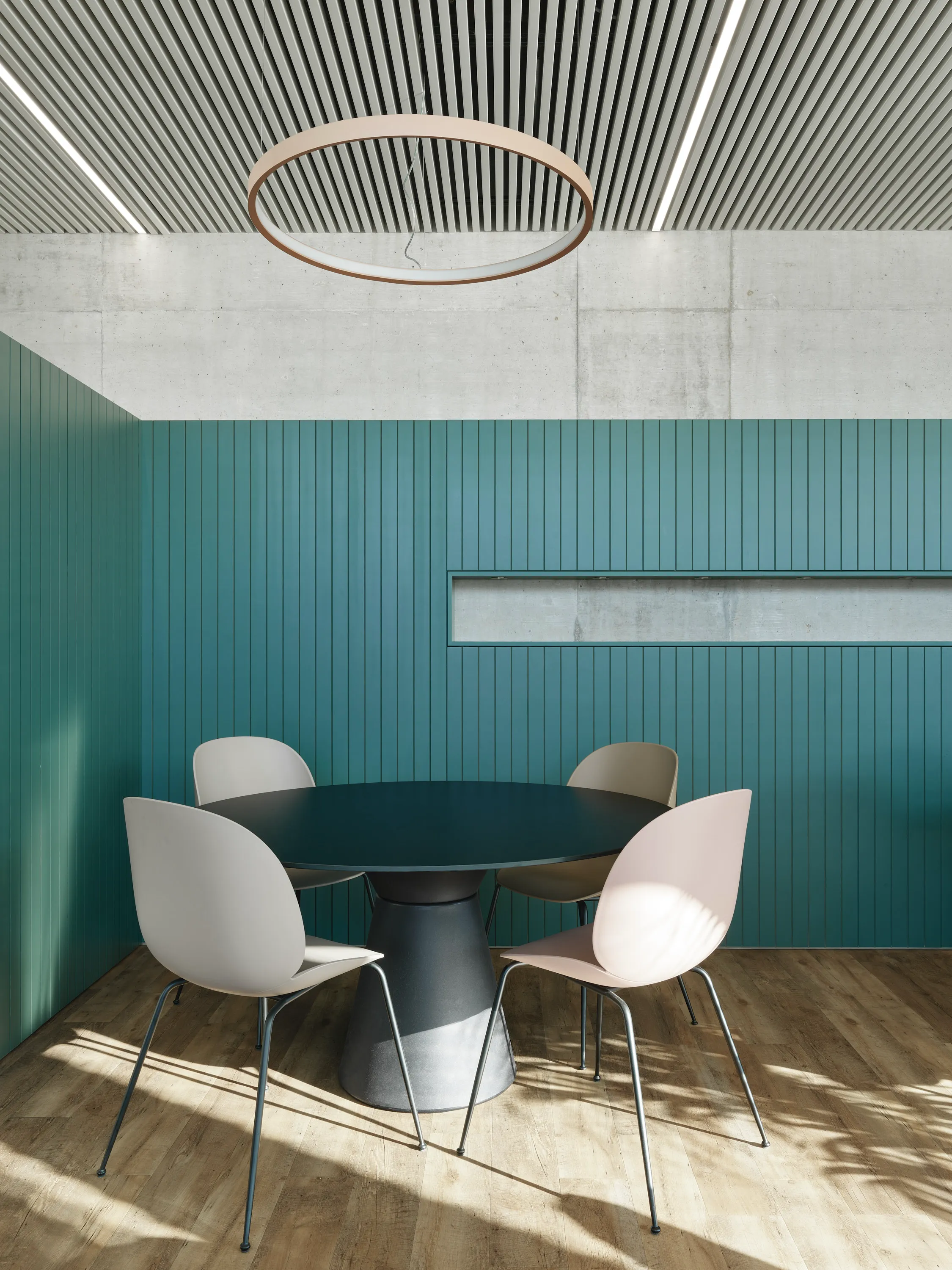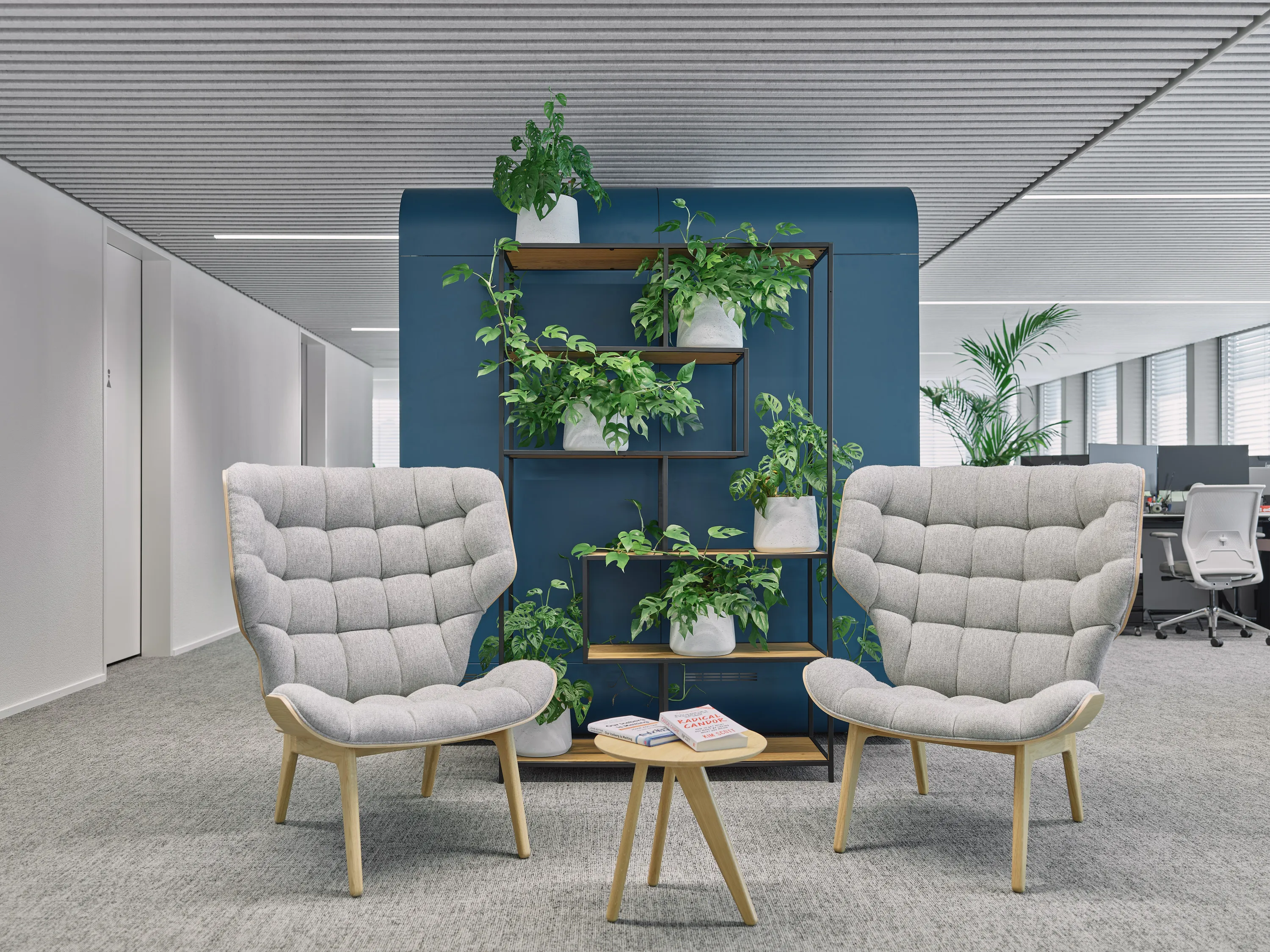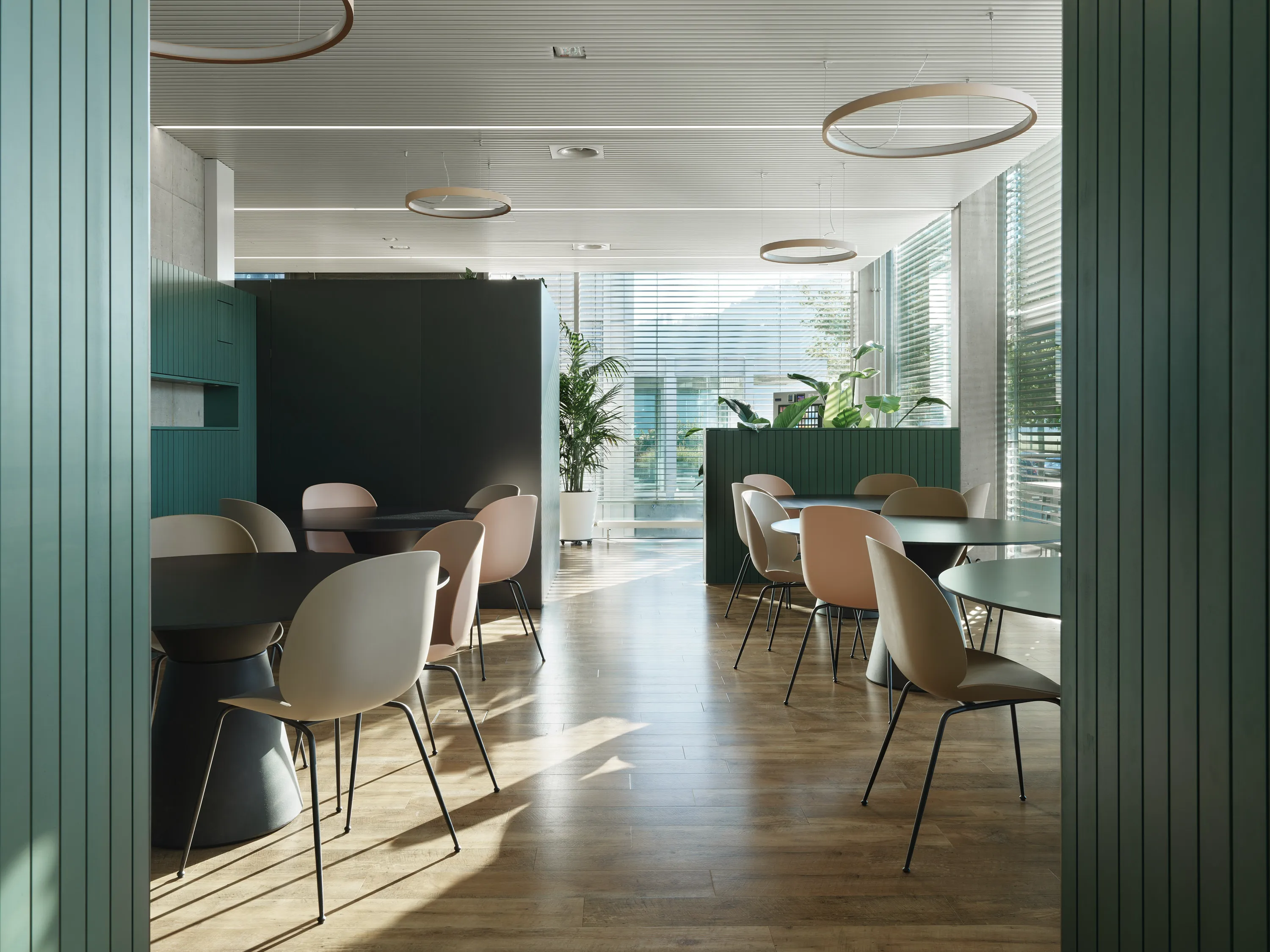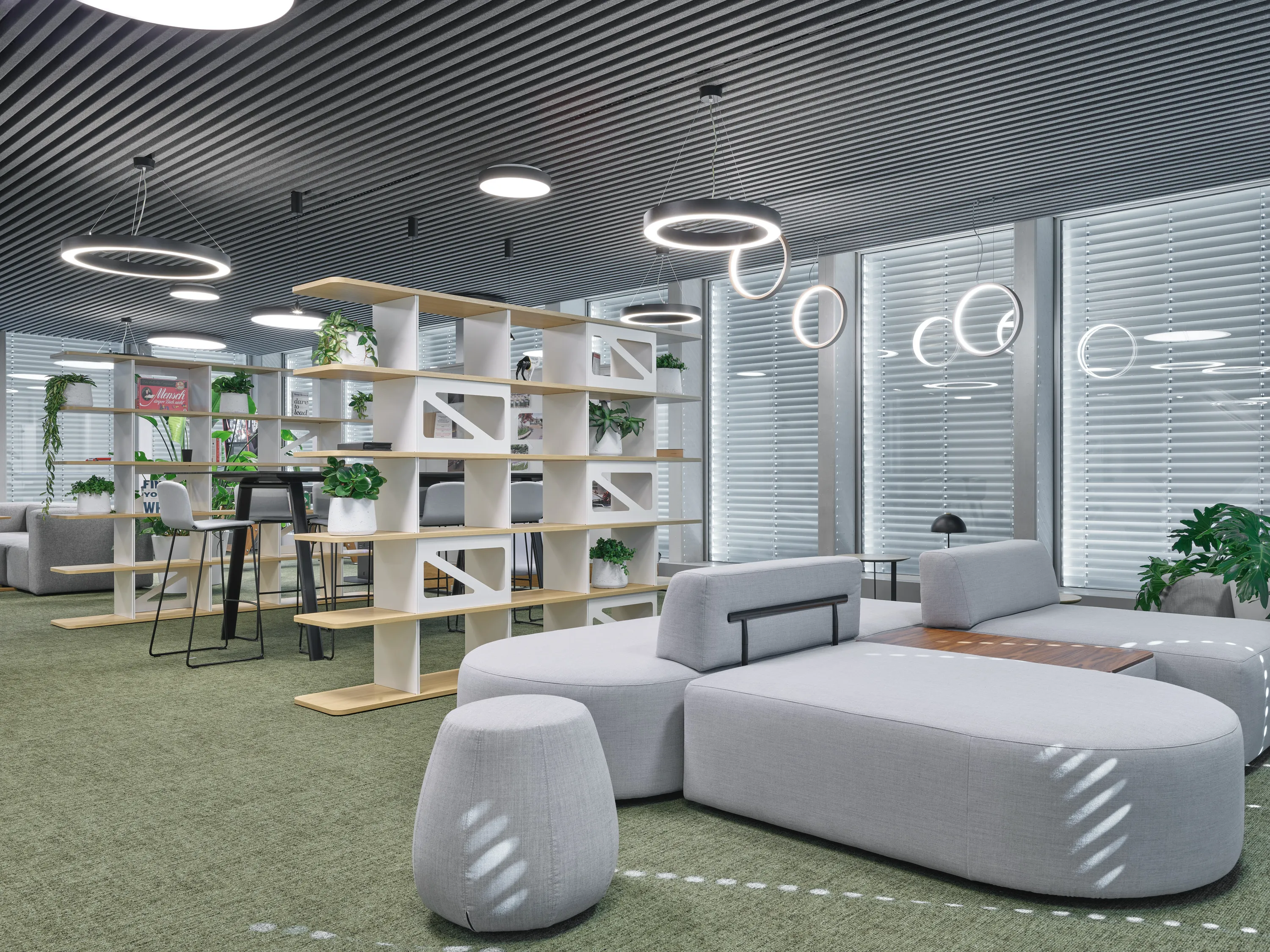 Der Rückbau auf die Grundstruktur ermöglichte eine flexible Neuordnung der Räume. Transparente Trennsysteme, akustisch wirksame Elemente, abgestimmte Material- und Farbwelten sowie gezielte Begrünung schaffen ein fein gegliedertes Raumgefüge aus Arbeits-, Rückzugs- und Austauschzonen. So entsteht eine funktional klare und zugleich atmosphärisch hochwertige Arbeitsumgebung, die unterschiedliche Nutzungen präzise abbildet.